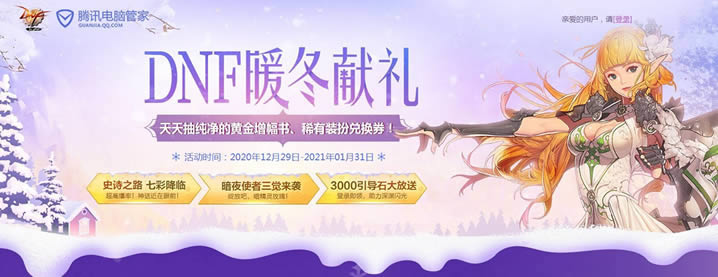 近期《DNF》上线了一个免费领福利《DNF》2021腾讯电脑管家暖冬献礼活动。玩家们登录活动页面就可以获得抽奖机会以及各种丰富奖励,那么这个活动在哪参加呢?下面小编就带着大家一起来了解一下《DNF》2021腾讯电脑管家暖冬献礼活动的详细内容吧!