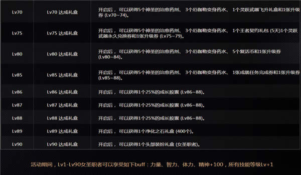 【4】活动期间,Lv1-Lv90女圣职者可以享受如下buff:力量、智力、体力、精神+100,所有技能等级Lv+1