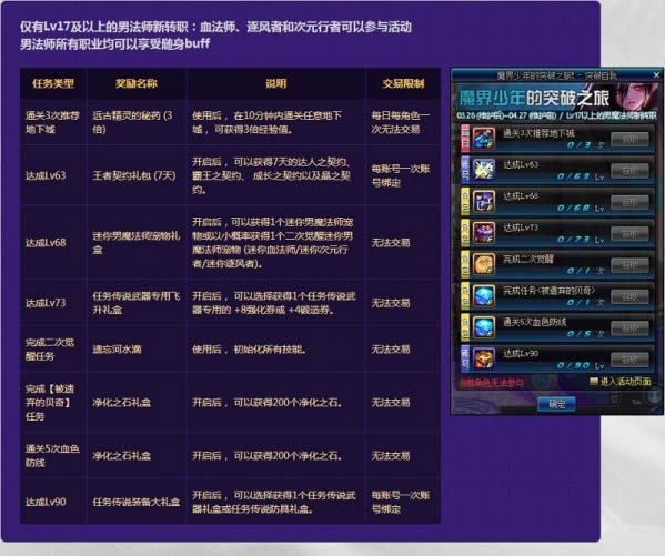 地下城与勇士自从男魔法师二觉开放后,使用男法的玩家越来越多,当大家正在为男魔法师升级困难的时候,不用担心,dnf官方推出了一个叫做魔界少年的突破之旅的升级助力活动,参与到该活动中可以让您的角色升级更快,马上参与到活动中吧。