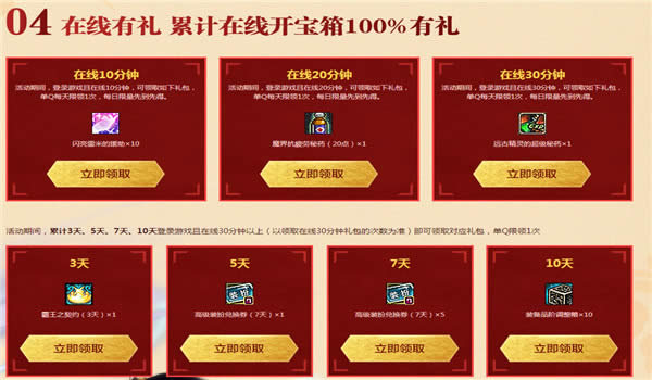 5、活动期间,登录游戏且在线10分钟、20分钟、30分钟,可领取对应礼包,每日限量,先到先得;