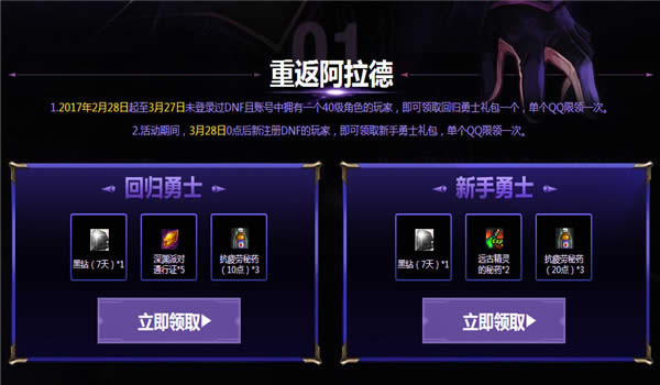 1.2017年2月28日起至3月27日未登录过DNF且账号中拥有一个40级角色的玩家,即可领取回归勇士礼包一个,单个QQ限领一次。