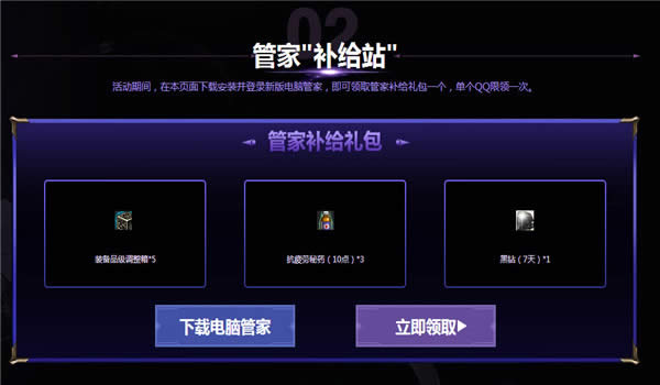 3.活动期间,在本页面下载安装并登录新版电脑管家,即可领取管家补给礼包一个,单个QQ限领一次。
