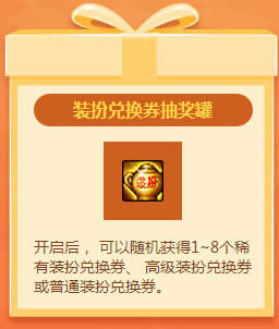 开启后, 可以随机获得1~8个稀有装扮兑换券、 高级装扮兑换券或普通装扮兑换券。
