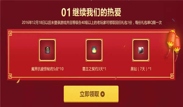 1、2017年8月30日起至9月30日未登录过DNF且账号中拥有一个40级角色玩家,即可领取回归勇士礼包一个,单个QQ限领一次;