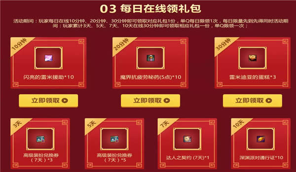 4、活动期间,每日游戏在线30分钟,可领取在线30分钟礼包一份,并获得一个活跃徽章(每日最多获得一个);徽章可兑换相应的礼包,兑换将扣除当前拥有的徽章个数,