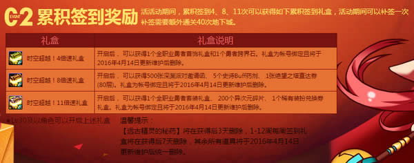 活活动期间,累积签到4、8、11次可以获得如下累积签到礼盒,活动期间可以补签一次。补签需要额外通关40次地下城。