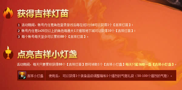 每天收集88个吉祥灯苗点亮吉祥灯笼即可获得奖励,保持在线或通关推荐地下城也可以获得吉祥灯苗,每个帐号每天只能参加一次