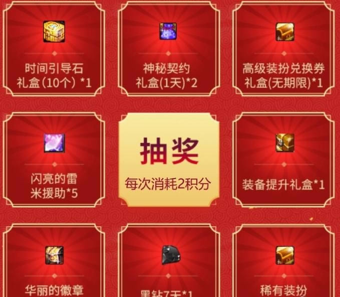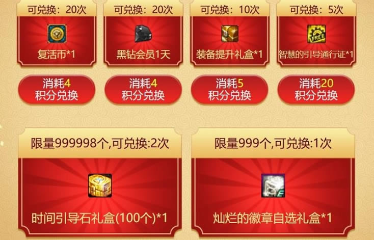 获得的积分可以直接用于兑换黑钻、时间引导石礼盒、灿烂的徽章自选礼盒、智慧的引导通行证、装备提升礼盒、复活币等奖励