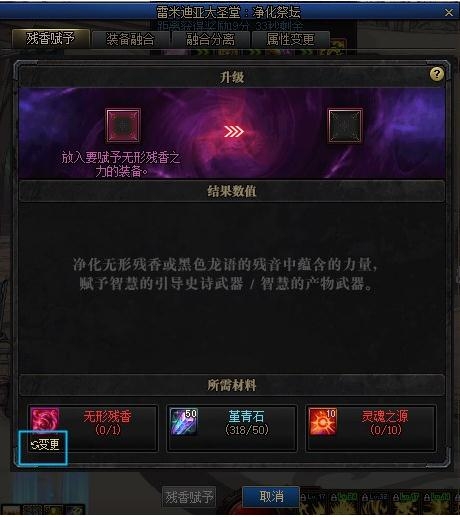 在残香赋予页面中,点击材料无形残香下方的变更按钮就可以将无形残香变更为黑色龙语的残。
