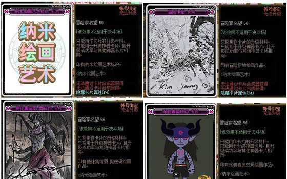 四张卡片均为神器级,只能用作卡片的升级材料,每张卡片的属性都是冒险家名望加56点