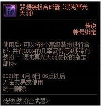 使用后,将8个高级装扮进行合成,并有100%的几率获得第4期稀有装扮 - 混沌冥光天羽装扮的指定部位。