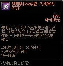 使用后,将8个高级装扮进行合成,并有100%的几率获得第4期稀有装扮 - 光明冥光天羽装扮的指定部位。