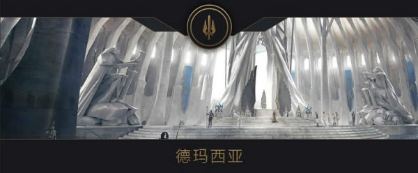 当时下着大雨,今天也在下着。北方的冻雨倾泻而下,冲刷着犬牙交错的群山。这道山脉便是德玛西亚和弗雷尔卓德间的天然屏障。此刻,一场风暴正在北方的山峰背后酝酿,但高山挡住了乌云,低处的山坡开始逐渐披上德玛西亚松树的绿毯。虽然青松不畏严寒,顽强地生长着,但却被常年的北风吹弯了腰。向东西两侧望去,无尽的山脉渐渐被蔚蓝的阴霾覆盖,天空则是压抑的暗黑色,就像她哥哥不苟言笑的性格。北边,高原的半山腰被森林覆盖,遍布悬崖和裂谷。这是一片险恶的土地,凶残的生灵和狂野的怪兽,应有尽有…………