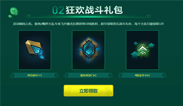 2.活动期间人机、极地/魄罗大乱斗或飞升模式任意获得10场胜利,即可领取欢乐战斗礼包,每个大区只能领取1次