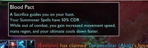 如果你在不回程且没有死亡的情况下击败3个敌人,就会获得恶魔之力,变为隐形并回复生命,在持续时间内获得大量移动速度加成。但是造成伤害后就会脱离恶魔形态,伤害为目标最大生命值20%的真实伤害。