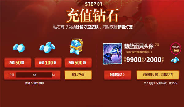 1在活动页面上使用Q币充值钻石,5Q币充值50钻石。在游戏客户端购买并使用魅蓝面具头像,赠送150钻石,单个大区头像只限购买一次。充值的钻石会在页面上显示。