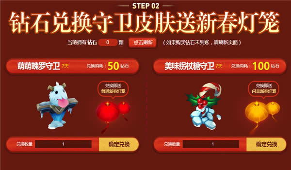 2使用钻石兑换守卫皮肤,其中50钻石兑换一份“萌萌魄罗守卫(7天)”,将获得赠“普通新春灯笼”一份;100钻石兑换一份“美味拐杖糖守卫(7天)”,将获得赠“闪亮新春灯笼”一份。兑换多份珍稀守卫皮肤,使用时间叠加计算。
