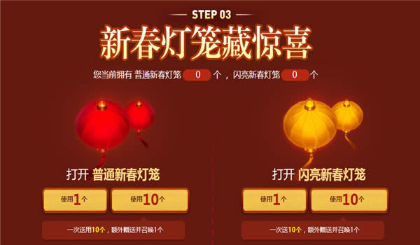 5本次活动提供”送10个”功能,每次使用”送10个”功能会额外获赠并送1个对应级别的新春灯笼。
