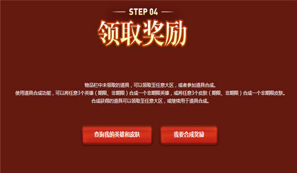 7道具栏中未领取的道具,可以参加道具合成。道具合成功能可以将道具栏中任意3个英雄(期限、永久)合成一个随机永久英雄,任意3个皮肤(期限、永久)合成一个随机永久皮肤。合成出的道具可以领取到任意大区,也可以继续参与合成。