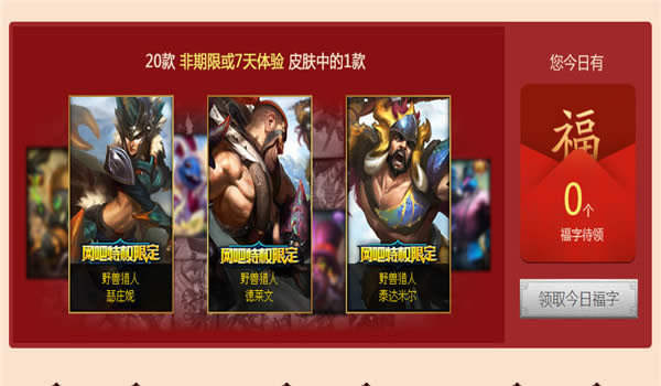 1.动期间每日(0点至21点)在特权网吧中使用特权拿到1场胜利,当日即可随机领取1个未收集的福字,集满一副对联即可兑换年货皮肤。每人每日最多可领取3个福字,获得的福字请当日领取,隔日作废!
