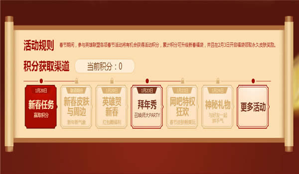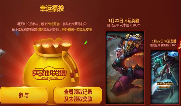 所有参与的召唤师都将获得一个新春福袋,收集积分即可升级福袋,获得永久皮肤奖励,达到500积分,升级为恭喜发财福袋,必须达到500积分以上福袋才能打开哦