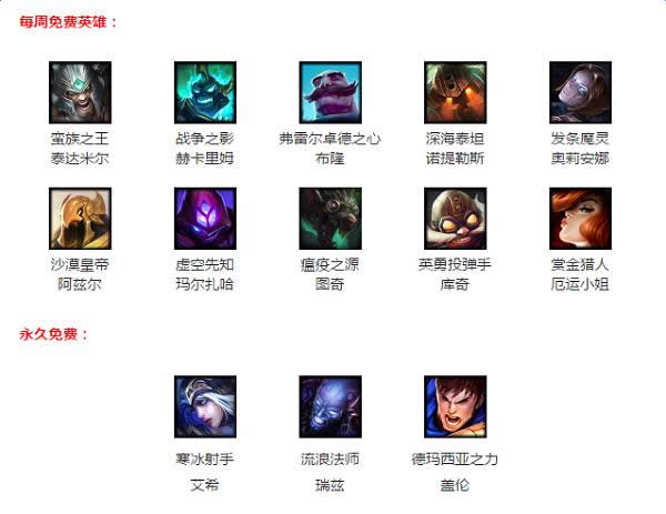 另外,在中国的服务器中,我们额外增加了三个永久免费的英雄——寒冰射手艾希、德玛西亚之力盖伦和流浪法师瑞兹。这三个英雄是永久免费供所有玩家使用的。主要目的也是便于那些刚刚打完新手实战训练营的玩家能够至少有一个自己会用的英雄。