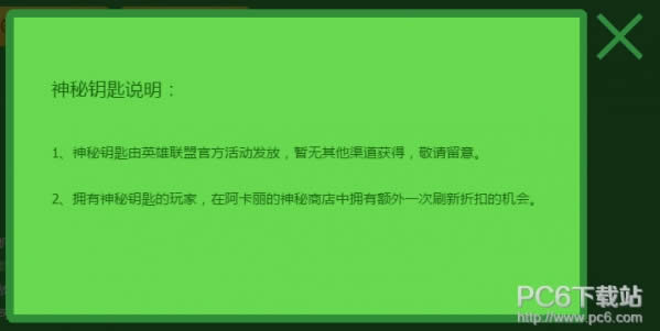 2、拥有神秘钥匙的玩家,在阿卡丽的神秘商店中拥有额外一次刷新折扣的机会。