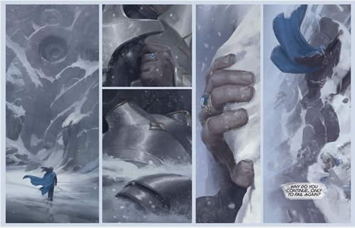 各位可能注意到了,第六幅图片中塔里克如之前我们见到的一样丢失了自己的戒指。小编看这个故事却脑洞大开想起了小时候看的阿波罗之子俄耳甫斯入冥府救妻子不能回头的故事,小编小小邪恶了一下。那么宝石攀登巨神峰到底为了什么?大家拭目以待吧!