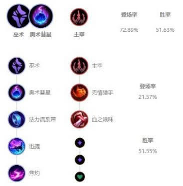 巫术能够强化风女的技能,主宰可以提升她的爆发伤害。巫术中的奥术彗星能够让风女在对线消耗时伤害更高,焦灼增加了后续的灼烧伤害。主宰中的血之滋味可以增加治疗效果,提高续航。无情猎手带来的移速加成,配合风女自身的高移速,跑图能力更强。