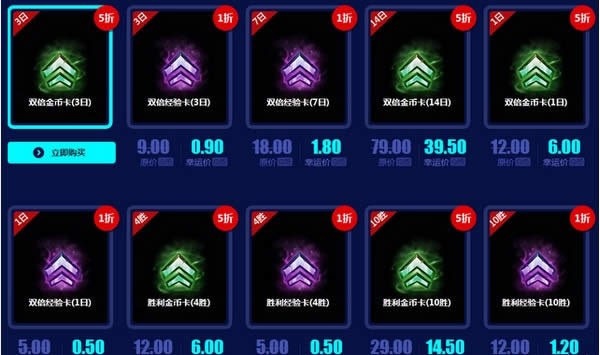 加成道具购买一个,仅限本人购买。经验卡1折,金币卡五折。
