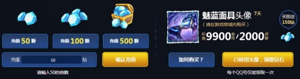 1.在活动页面上使用Q币充值钻石,5Q币充值50钻石。在游戏客户端购买并使用期限头像“魅蓝面具”,赠送150钻石,单个大区头像只限购买一次。充值的钻石会在页面上显示。
