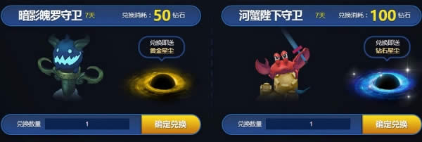 2.使用钻石兑换珍稀守卫皮肤,其中50钻石兑换一份“暗影魄罗守卫(7天)”,赠“黄金星尘”一份;100钻石兑换一份“河蟹陛下守卫(7天)”,赠“钻石星尘”一份。兑换多份珍稀守卫皮肤,使用时间叠加。
