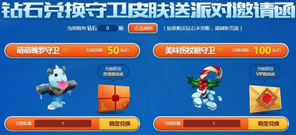 2. 使用钻石兑换守卫皮肤,其中50钻石兑换一份“萌萌魄罗守卫(7天)”,将获得赠“普通邀请函”一份;100钻石兑换一份“美味拐杖糖守卫(7天)”,将获得赠“VIP邀请函”一份。兑换多份珍稀守卫皮肤,使用时间叠加计算。