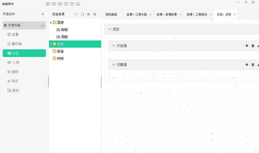 提供故事、事件轴、设定、人物、细纲、写作、素材等诸多文档的多选项卡窗口形式,方便即时切换必要的窗口。