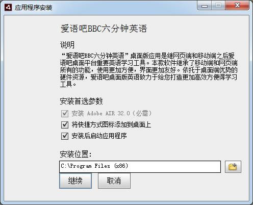 1.到本站下载安装bbc六分钟英语,打开安装程序,点击文件夹选择软件安装位置,点击继续