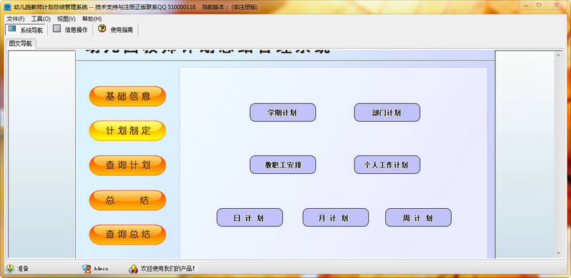 幼儿园教师计划总结管理系统专为幼儿园教师打造,有效率的完成统一管理和查阅,用户可以通过此软件查看基础信息、计划制定、总计、查询等,提高工作效率。主要包括基础信息、计划制定、总计、查询等功能。本管理系统多处具有快速辅助录入功能,操作简单,易学、易用。