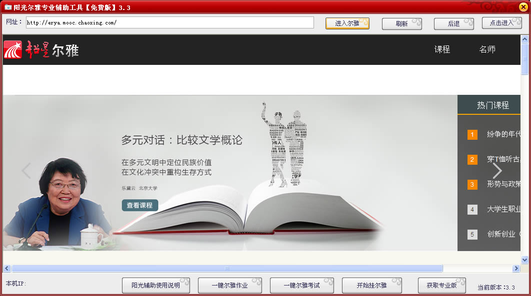 阳光尔雅专业辅助工具是一款绿色免费、简单易用的尔雅通识课辅助工具。该软件界面清晰、整洁,内置丰富、完整的题库,同时支持软件多开挂尔雅,绝对给力。欢迎下载使用!