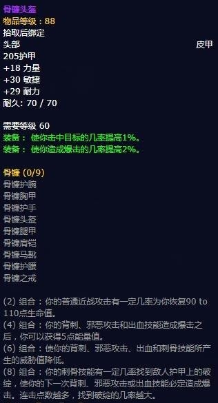 骨镰套对于匕首贼的提升还是非常明显的,在之前的版本匕首贼输出可能比不上狂暴战,但是骨镰套的匕首贼单体输出绝对碾压了狂暴战。2套组合效果是 你的普通近战攻击有一定几率为你恢复90 to 110点生命值;4套组合效果是 你的背刺、邪恶攻击和出血技能造成爆击之后,你可以获得5点能量值;6套组合效果是 使你的背刺、邪恶攻击、出血和刺骨技能所产生的威胁值降低; 8套组合效果是 你的刺骨技能有一定几率找到敌人护甲上的破绽,使你的下一次背刺、邪恶攻击或出血技能必定造成爆击。连击点数越多,找到破绽的几率越大。