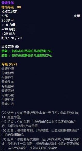 骨镰套的基础属性非常不错,并且套装效果也是可圈可点,尤其4套组合效果是 你的背刺、邪恶攻击和出血技能造成爆击之后,你可以获得5点能量值;8套组合效果是 你的刺骨技能有一定几率找到敌人护甲上的破绽,使你的下一次背刺、邪恶攻击或出血技能必定造成爆击。连击点数越多,找到破绽的几率越大。这相当于变相提高了剑贼输出的上限。