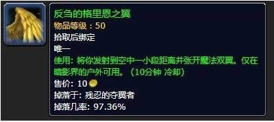 反刍的格里恩之翼由晋升堡垒稀有残忍的夺翼者掉落,玩家可以使用该道具在暗影界的户外空中飞行较短的时间。玩家使用该道具,可以轻松前往以前到达不了的地区,解锁全新的道具,简直就是野外发掘宝藏必备的玩具。
