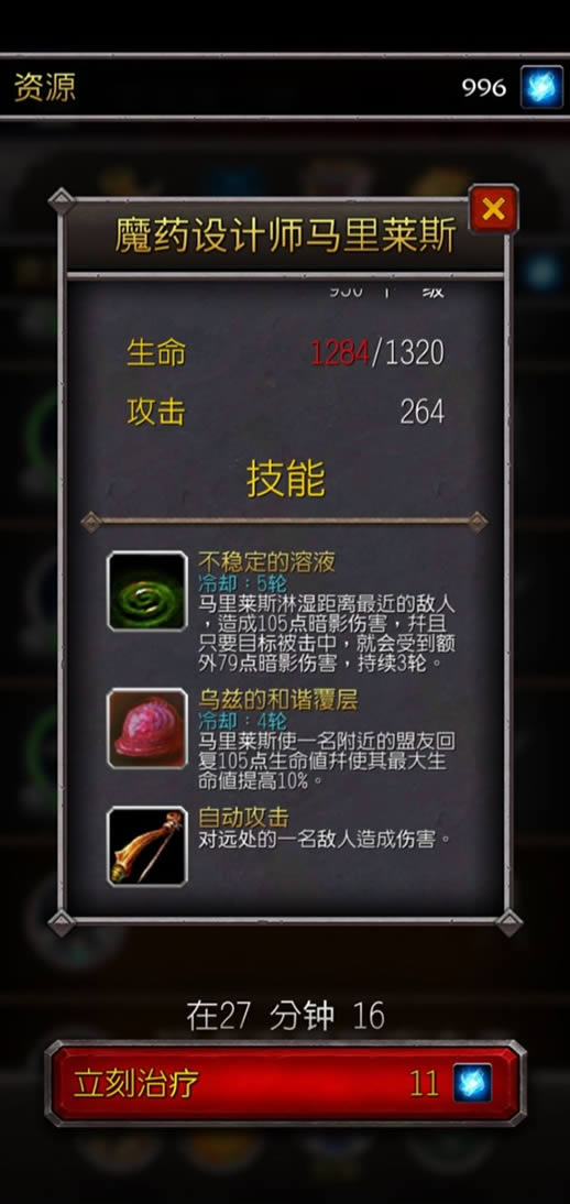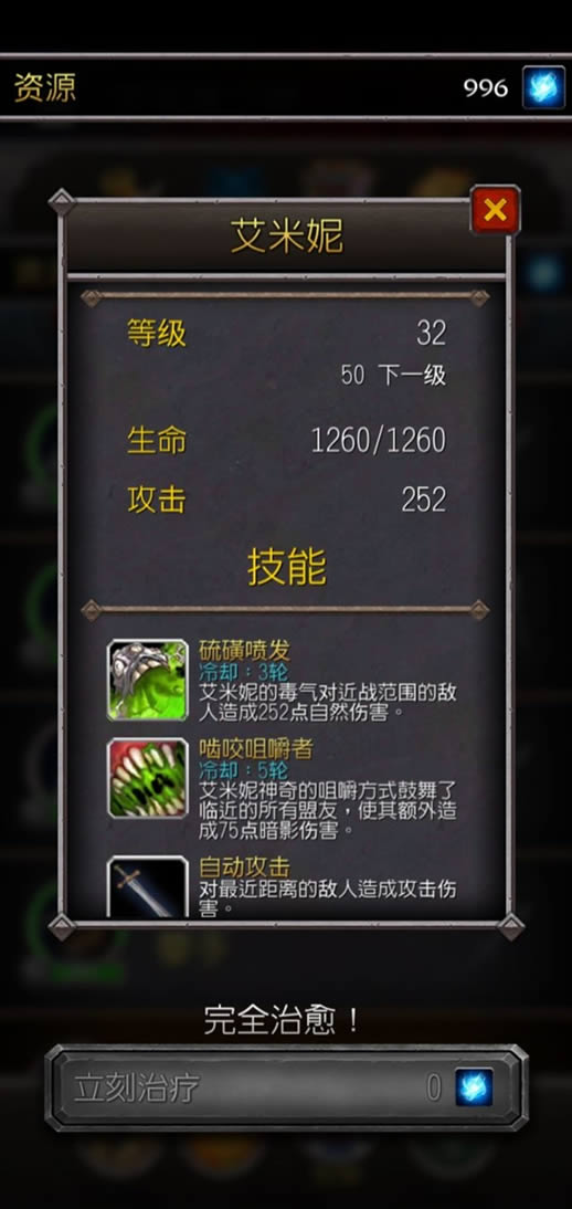 为了保证艾米尼的战吼能够覆盖到全队,一般都把艾里尼放在2号位。但是实际过程中,我发现出手的顺序一般是13号位先出手,然后2号位,然后45号位。如果艾米尼放在2号位很容易让13号位放出的技能,吃不到艾米尼的战后加成。要想让艾米尼成为队里最早出手的,那么就应该放在13号位。但又由于艾米尼看起来是个憎恶,实际上是个皮薄高攻的刺客角色(见下图),所以挨最毒打的1号位明显不适合艾米尼。