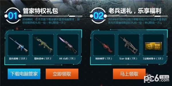 1、活动期间,在本页面下载安装并登录电脑管家,即可领取特权礼包一份(单Q限领一次)2018年07月03日前注册账号且7月23日后未登录的老兵可直接领取回归礼包一份(单Q限领一次)