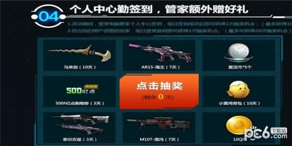 4、活动期间,登录电脑管家个人中心签到,每日签到成功后即可获得1次抽奖机会;(最多获得10次抽奖机会)2.符合回归用户资格的玩家,每日登录游戏即可获得1次抽奖机会。(最多可获得20次抽奖机会)