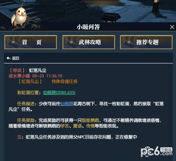 逆水寒虹落凡尘奇遇怎么做?逆水寒虹落凡尘的奇遇奖励一只鹦鹉宠物,但是很多玩家不知道虹落凡尘奇遇怎么做,下面就一起来看看逆水寒虹落凡尘奇遇攻略吧。