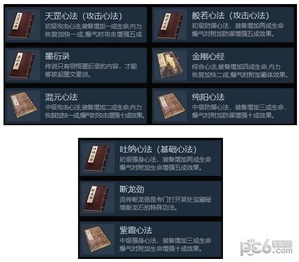 综合心法,装备增加四成生命和内力,恢复加快二成,爆气时附加霸体效果。