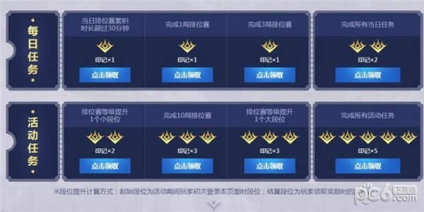 在整个活动期间只可完成一次※段位提升计算方式:起始段位为活动期间玩家初次登录本页面时段位;结算段位为玩家领取奖励时的实时段