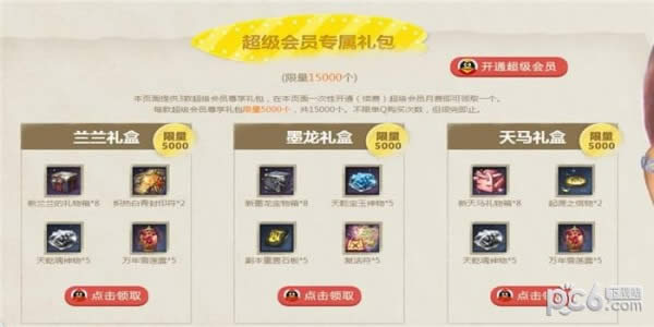 3、本页面提供3款超级会员尊享礼包,在本页面一次性开通(续费)超级会员月费即可领取1个。每款超级会员尊享礼包限量5000个,共15000个。不限单Q购买次数,但领完即止。(温馨提示:在本页面开通超级会员时,仅限通过Q点Q币/财付通/网银/微信支付等预付费方式支付的用户可领取礼包。通过手机话费、短信方式开通的用户无法领取礼包)
