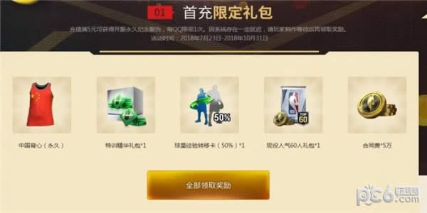 3.游戏商城每周都会刷新限量“现役人气30人限购包”,每次购买都可以获得1个巨星礼包勋章收集满40个后即可在游戏内领取一个“现役人气10人礼包”,可以获得游戏内具人气的10名巨星之一。活动时间:2018年7月23日-2018年12月31日