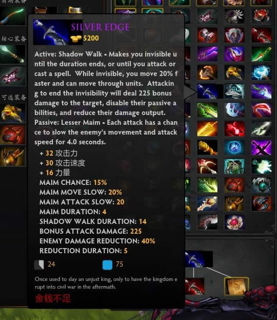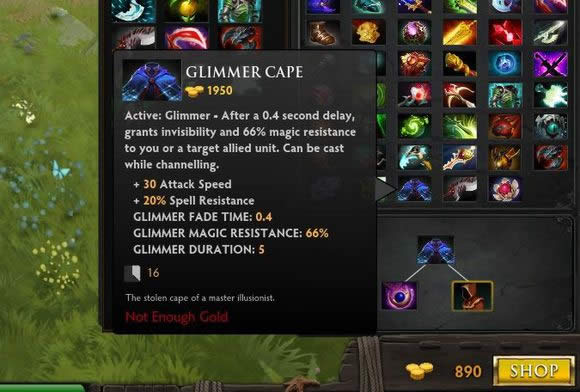 +30攻速 +20%魔抗 可以拆分,主动技能:对一个我方单位使用,0.4秒后隐身,隐身时魔抗+66% 持续5秒。该单位允许移动,攻击后会有0.4秒再度进入隐身的时间。16秒CD,900的施法范围