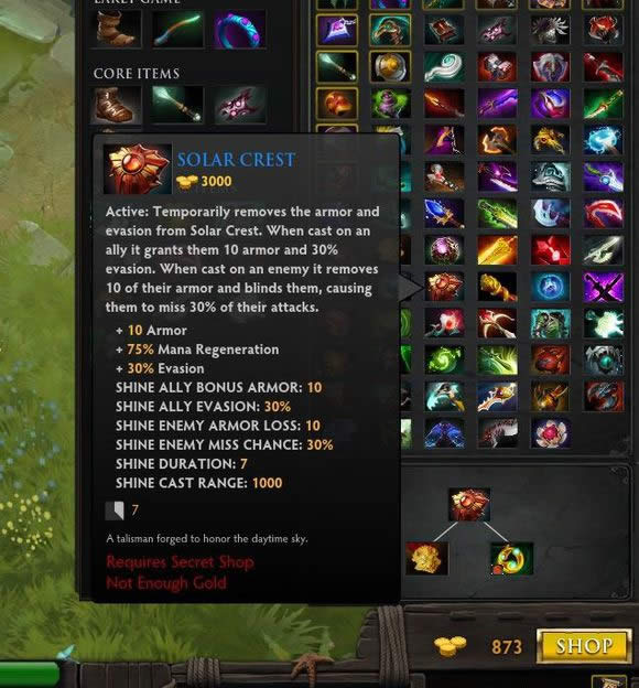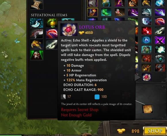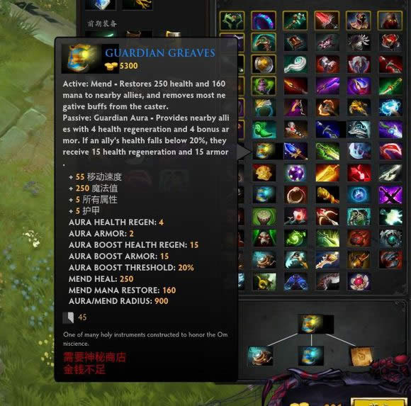 +5生命回复 +125%回魔 +10攻击力 +10护甲 主动使用:对友方单位使用,净化不良效果(无法清除晕眩),同时会为友方单位提供一个回声护甲,持续6秒钟。当回声护甲生效时,当敌方向该单位使用debuff时,该debuff反作用于施法者身上。17秒CD,100魔法消耗,900施法范围。(注释:和林肯的机制一样,但是它并不会阻挡技能,而是直接反弹技能。)